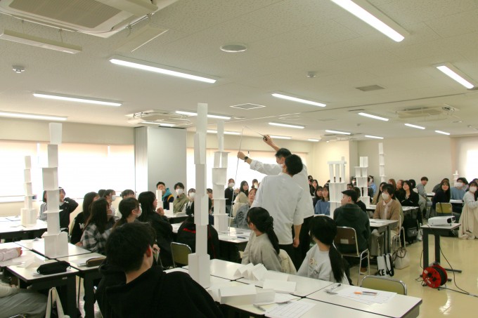 製菓本科とスイーツ科では、実習でスムーズにコミュニケーションを取れるように、協力して紙のタワーを作って、どのグループが一番高くできるか競ったり、お互いのことを知るために、共通点探しをしました。