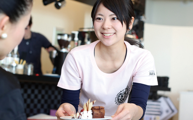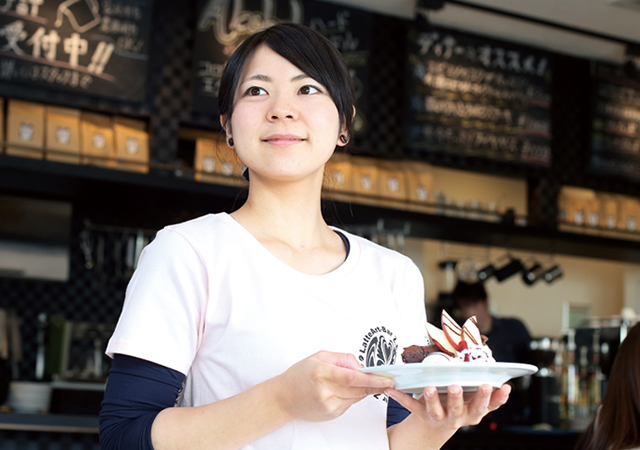 ドリンク作りや接客など、ホールの担当をしながらケーキ作りや仕込みをしています。いつも同じものを作ることも大切ですが、よりおいしいものを提供できるように、盛り付けやソースの組み合わせを変えるなどアレンジも試みています。お店の看板 メニューであるラテアートを通してコーヒーに興味を持っていただいたり、リピーターの方が増えるととてもやりがいを感じます。
